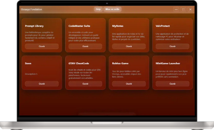 Le launcher Ocrasys est votre hub central pour toutes nos créations numériques. Il répertorie toutes nos applications, qu’elles soient en développement ou déjà déployées, et offre un accès direct à tous nos jeux en ligne. Simple, rapide et sécurisé, il vous permet de rester connecté à l’univers Ocrasys en un clic.